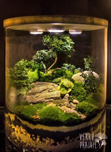 Tous les Terrariums se composent de substrat, mousse, liège, pierre, gravier, sable, plantes. Un couvercle bois simple ou double ou bouchon liège avec éclairage led